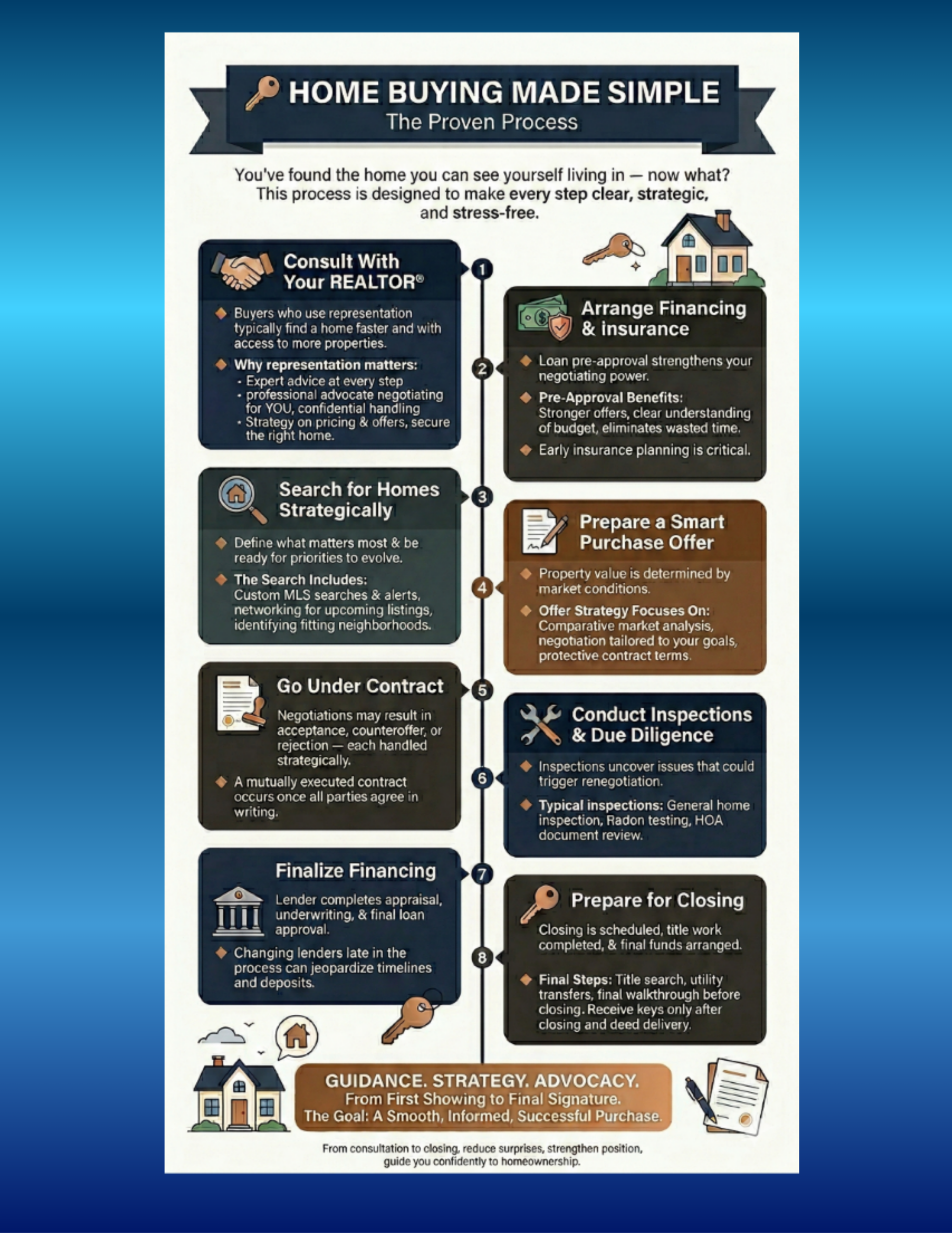 There’s a ton of detailed information available here covering every part of the home-buying process in Colorado—from writing and negotiating your offer, through due diligence (inspections, radon, HOA docs), financing steps, title work, final walk-through, and all the way to closing day.